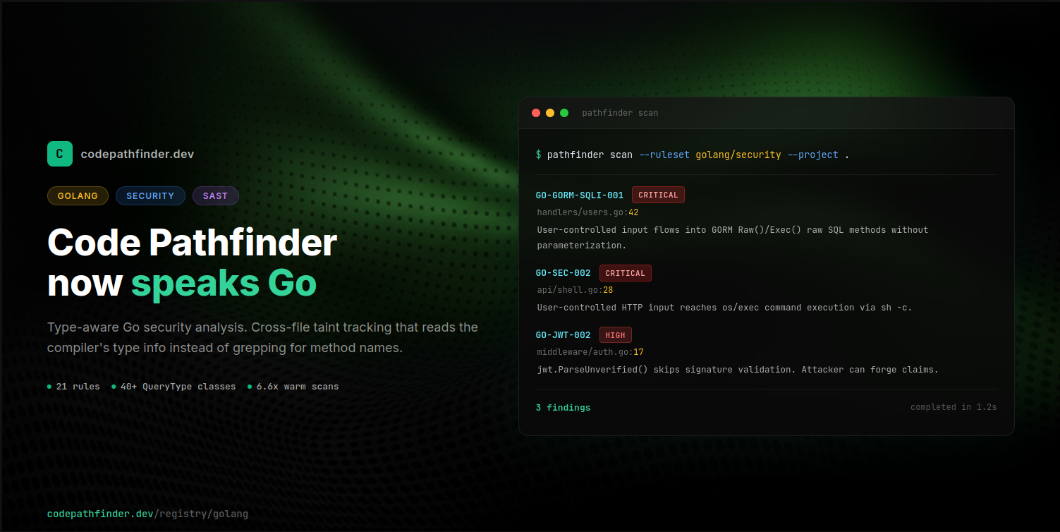 That gap is what pushed me to finish Go support in Code Pathfinder. It ships today in v2.1.0: 21 security rules, 204 Go classes documented in the SDK reference (66 with verified source/sink annotations, covering Gin, Echo, Fiber, GORM, sqlx, gRPC, and the Go standard library). Warm scans are 6.6x faster than cold.